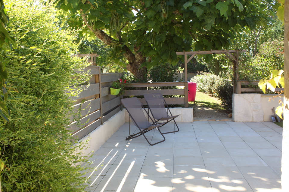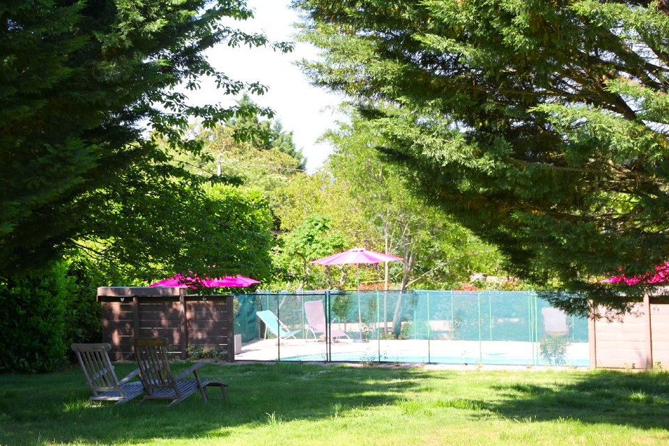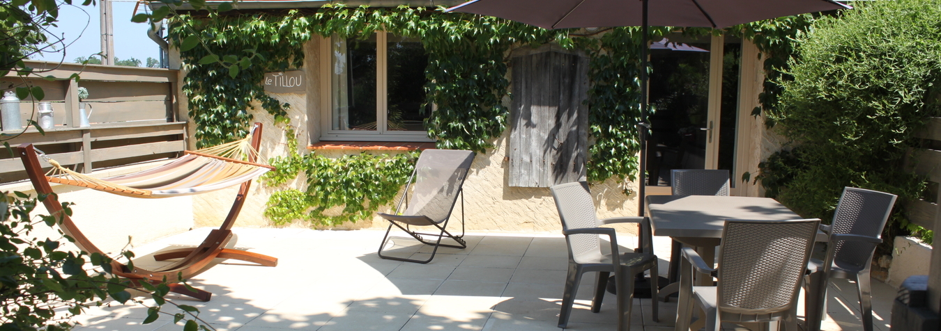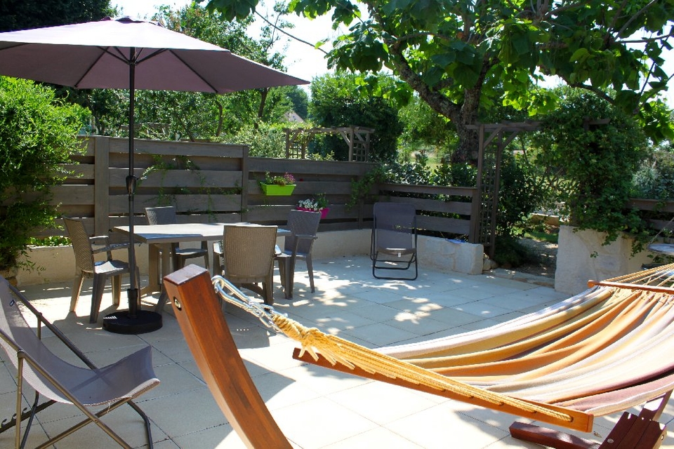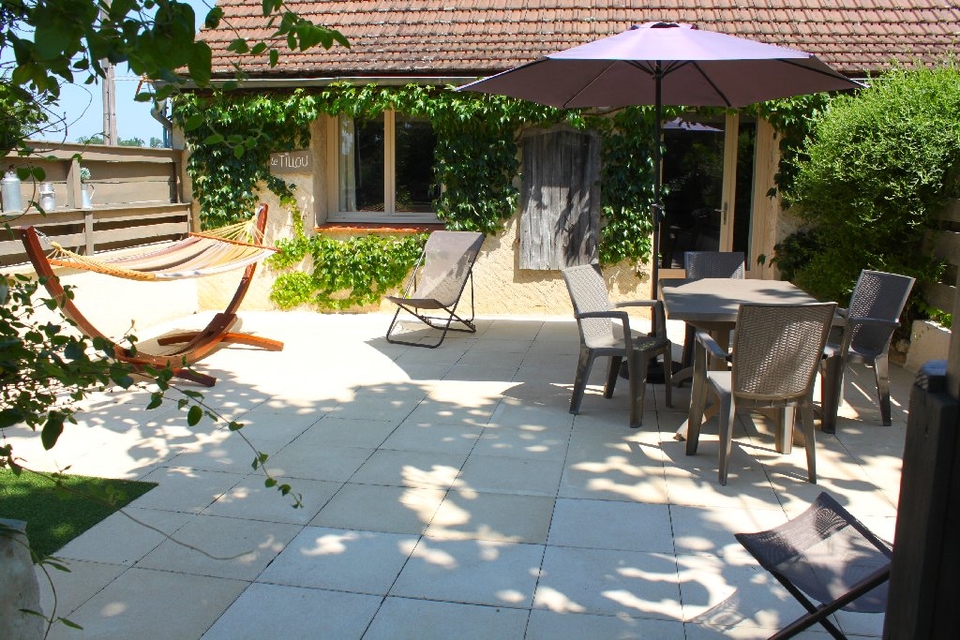 Il est exposé plein sud, sur l'aile de la grange tout proche de la piscine commune aux deux autres gites et occasionnellement aux propriétaires. Il donne sur une grande terrasse privative pleine de charme de 48 mètres carrés, avec salon de jardin, parasol, barbecue canadien, transats et un grand hamac pour une détente digne des vacances.